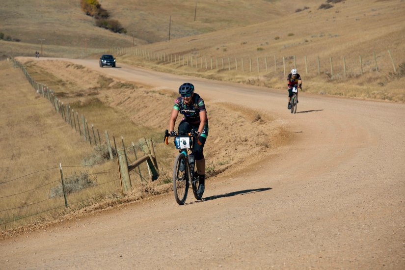 Out of Big Horn I climbed in a small group with Eric and South Dakota Guy, all of us taking small turns into the wind. I lost my group when I took a few seconds of non-pedaling to yank my bibs back down over my knee warmers (the worse!) and take a gel, but kept the guys in view. The course then turned onto the fantastic Dry Weather Road, which lives up to its name with baby head rocks, ruts, and overall awesomeness. After this fun stretch was over, we joined the 40 mile course where it leaves the pavement, and I was back into familiar territory from last year.