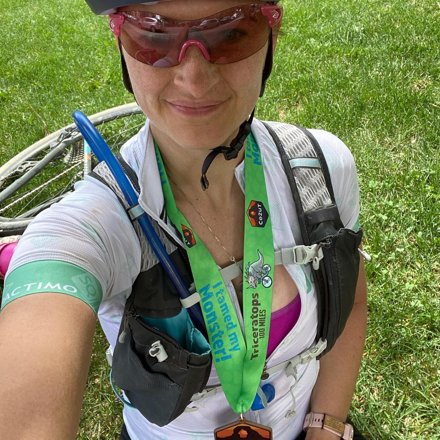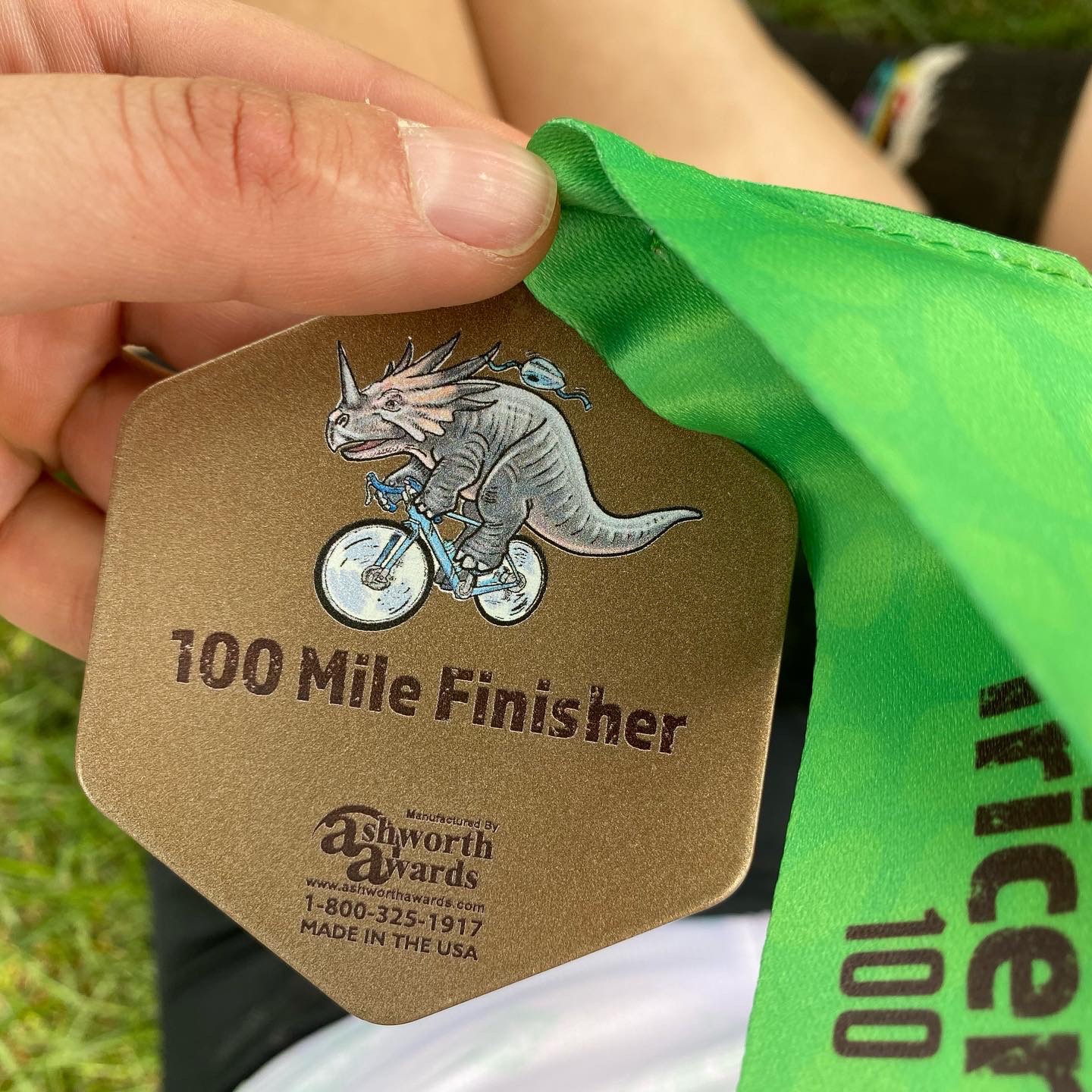 Officially 99 miles later, announcer Larry welcomed me across the finish line and I was handed my dinosaur finisher medal! Woohoo!! 6 hours 26 minutes total according to my Garmin (which included a few minutes of standing around at the start). Next order of business was yanking off the carbon soled shoes and apologizing to my feet. And taking a selfie. Sarah and Tom wandered over from Hot Tomato with a cup of ice water for me as I tried to figure out where results were posted.