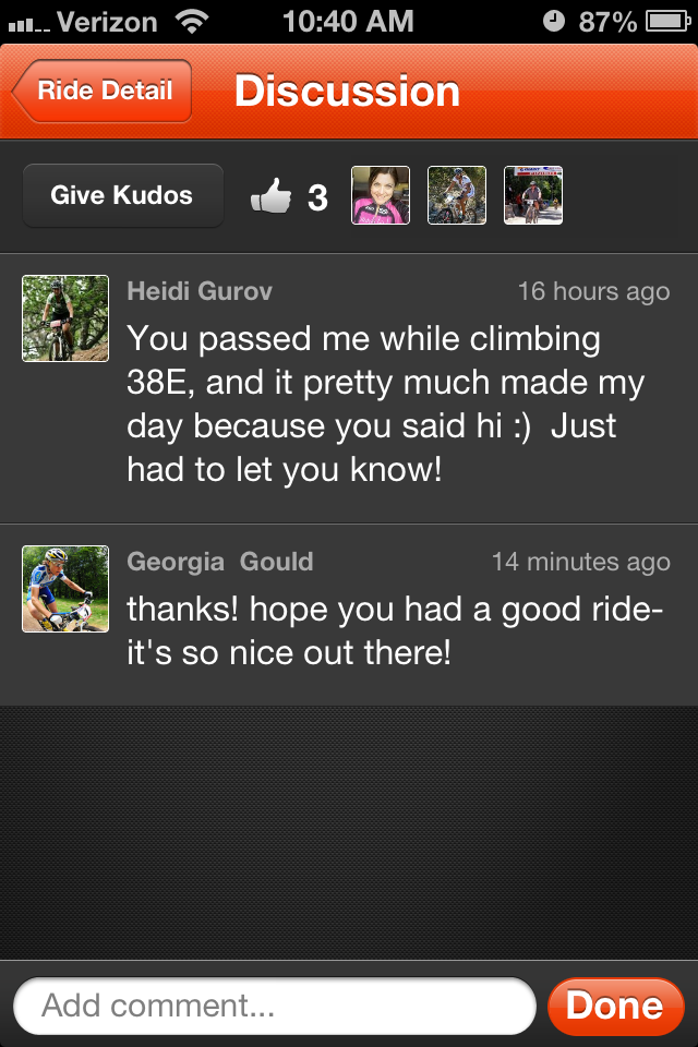 I seriously can’t even expressed my excitement over this. I honestly thought it was Lila that had caught up to me. It wasn’t until I saw the Luna kit and Georgia’s hair (I know, creepy I recognized her by her hair… I swear I am NOT that creepy, just observant!!) that it clicked. I frantically started quietly yelling “Matt, Matt, MAAATTTT!!!” and started pedaling like an idiot on crack to catch up to Matt, who turned around with huge eyes and a shocked expression. Whitney nonchalantly goes “Do you guys know who she is?” and both Matt and I giggled like obsessed school girls “Georgia Gould!!” As fast as she appeared, she disappeared up the road. And my day, week, month, possibly 2012 was made. I giggled like a retard, giddy with what just happened.