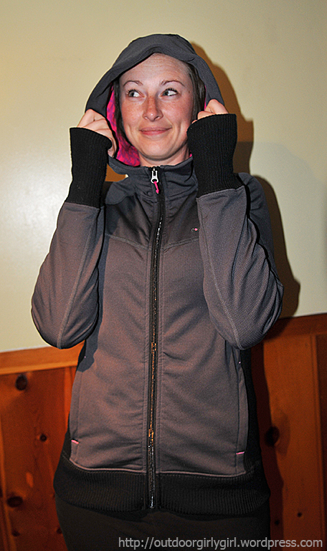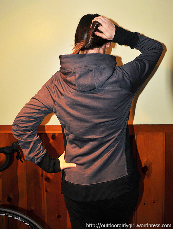 I especially like the high collar, which is something not found on any other hoodie-type items that I own. However, this is not the warmest jacket out there! Then again, I don’t think it’s intentioned to be a winter jacket. I have worn it in some 20 degree (with wind chills in the single digits) weather and the wind cut right through the fabric and didn’t leave me too warm and cuddly feeling. I think in milder spring/fall temperatures it will be quite perfect, along with perhaps chilly summer mornings (I suppose this just comes down to where a person lives!).