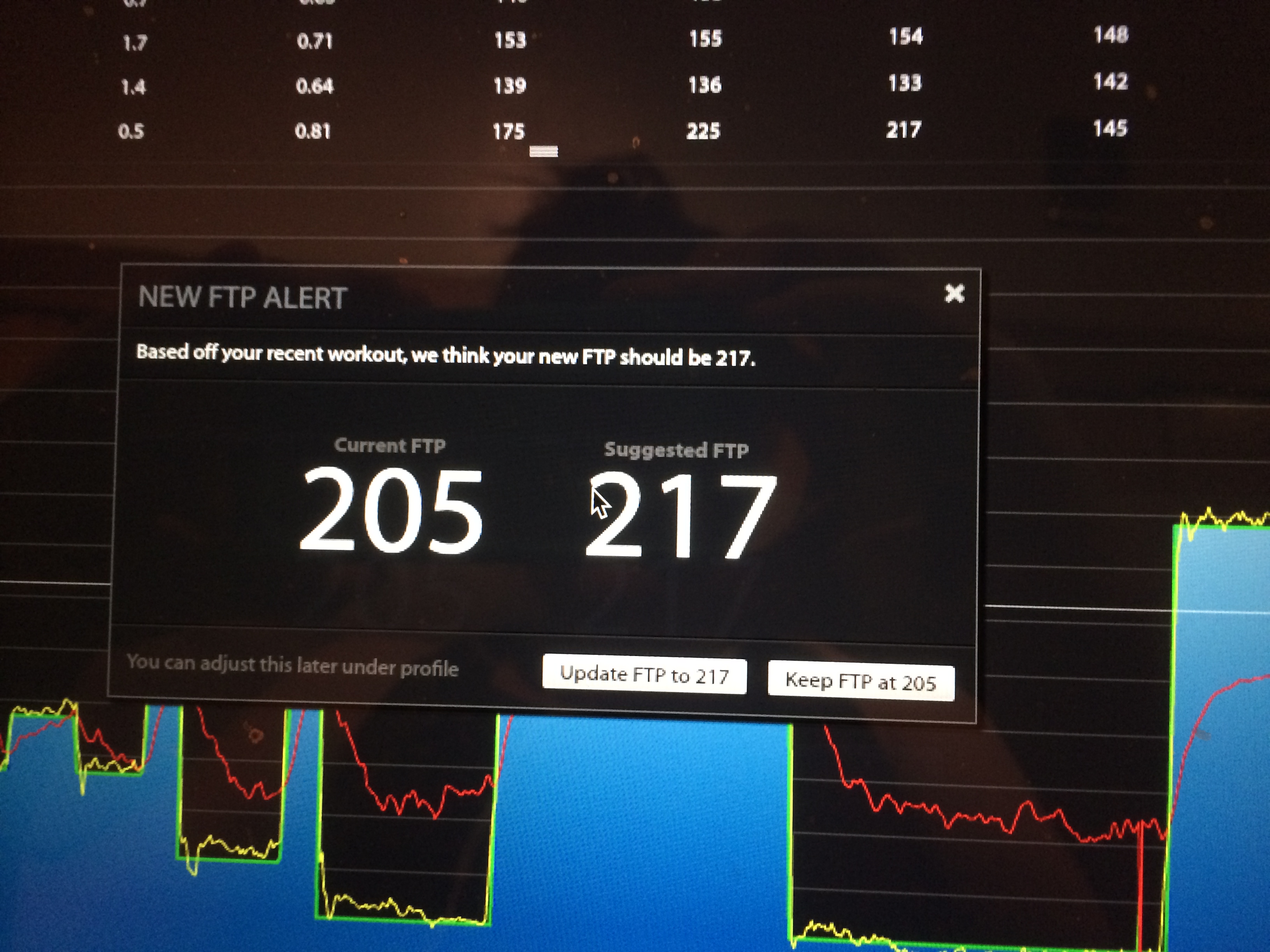 The big news is that increased my functional threshold power (FTP) from an initial 195 watts back in November to 217 with my test yesterday! 22 watt increase, woohoo! CritFit works, there’s no denying! There’s also no denying that structured training with interval workouts works… wait, that’s CritFit… I digress! Training with power is also the way to go, so thanks to TrainerRoad for that great software to allow this to happen without the big bucks being dropped on a power meter!