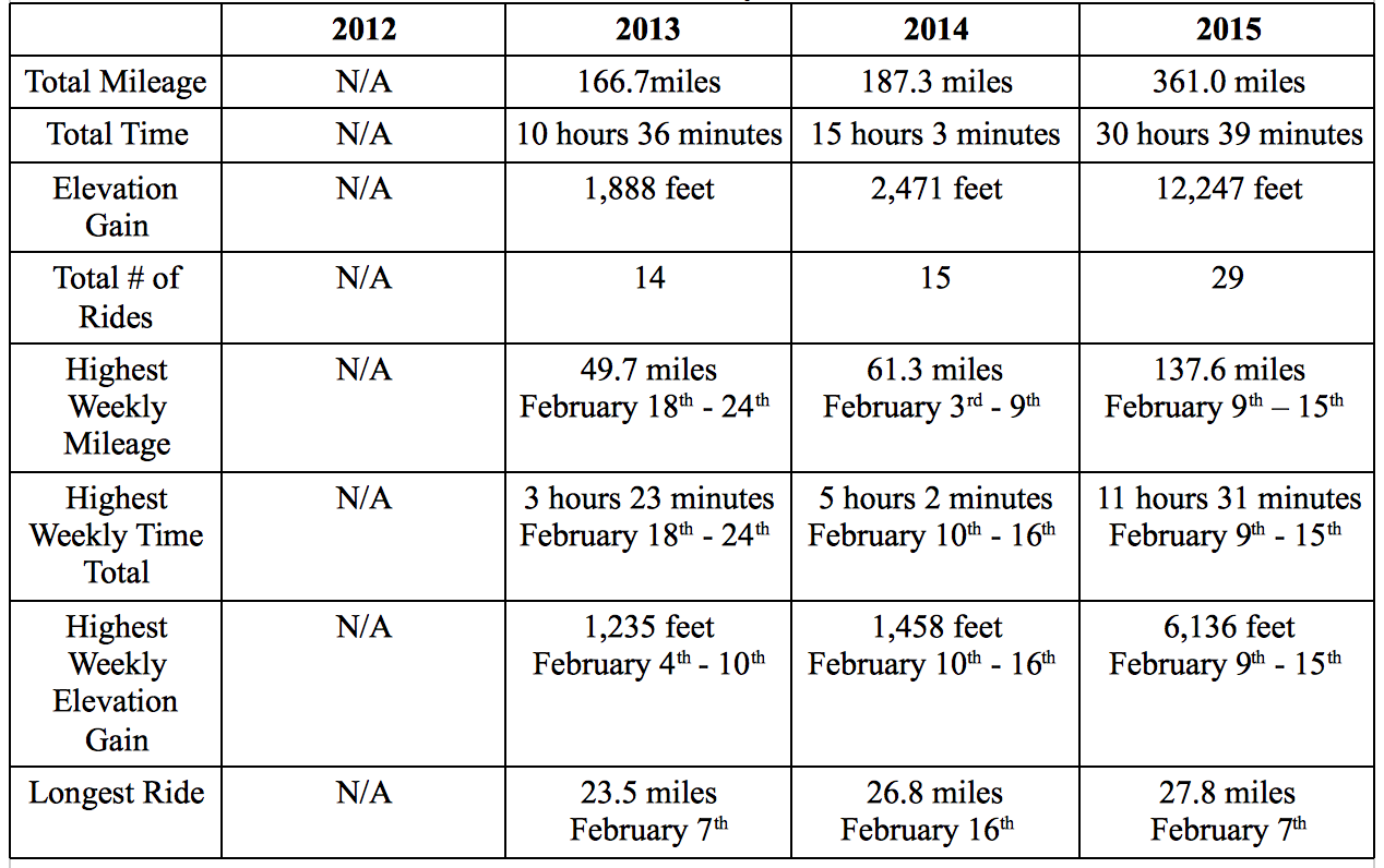Still on my kick with making charts, so here’s my February stats and comparison to years earlier. Once again, a big month, though the return of winter did kill my miles and time slightly the past two weeks, along with having a solid week of recovery after returning from Arizona. Still, over 30 hours of training/racing/riding is nothing to sneeze at! Not to mentioned I had my highest time duration week ever February 9th – 15th 🙂