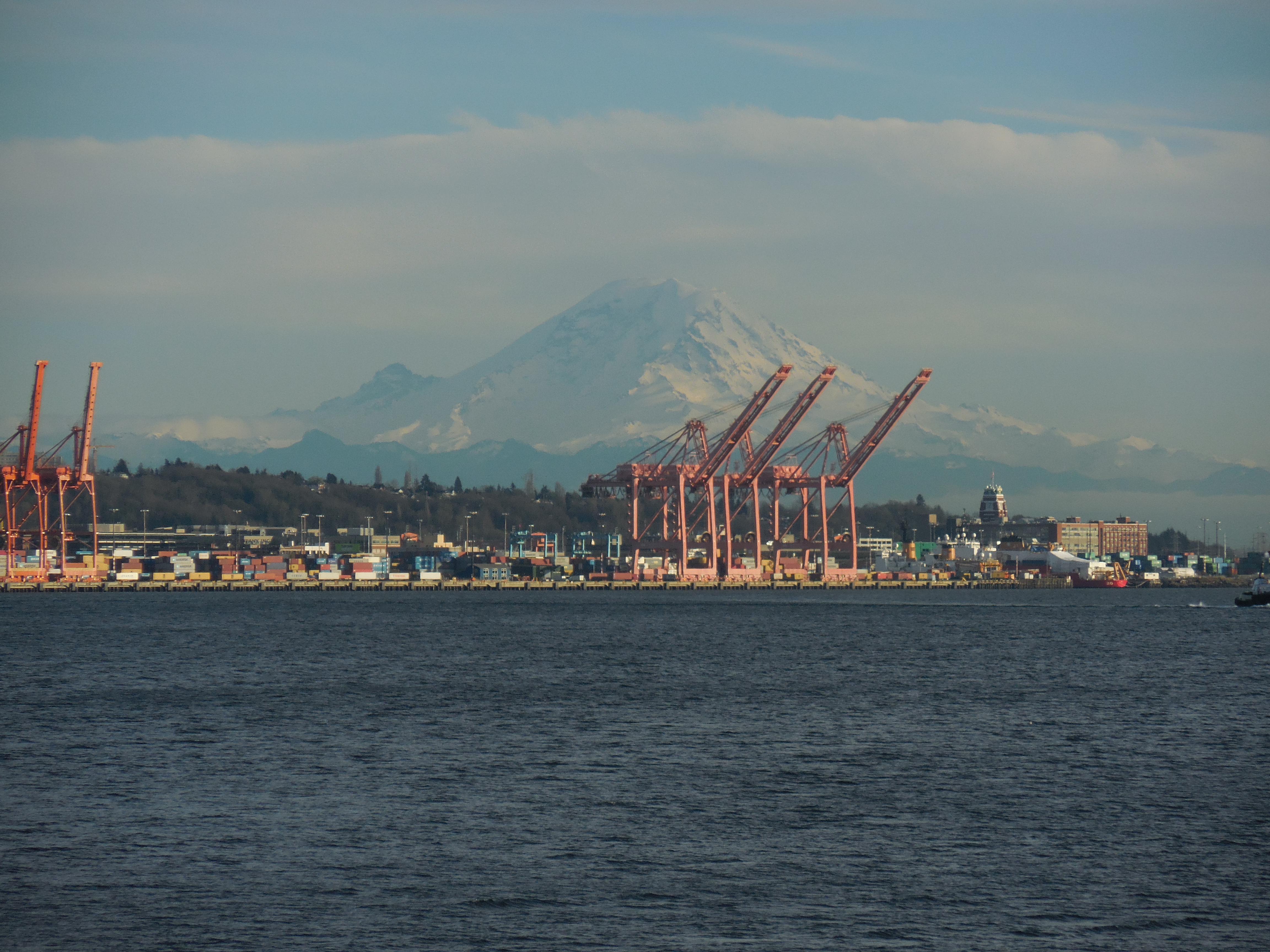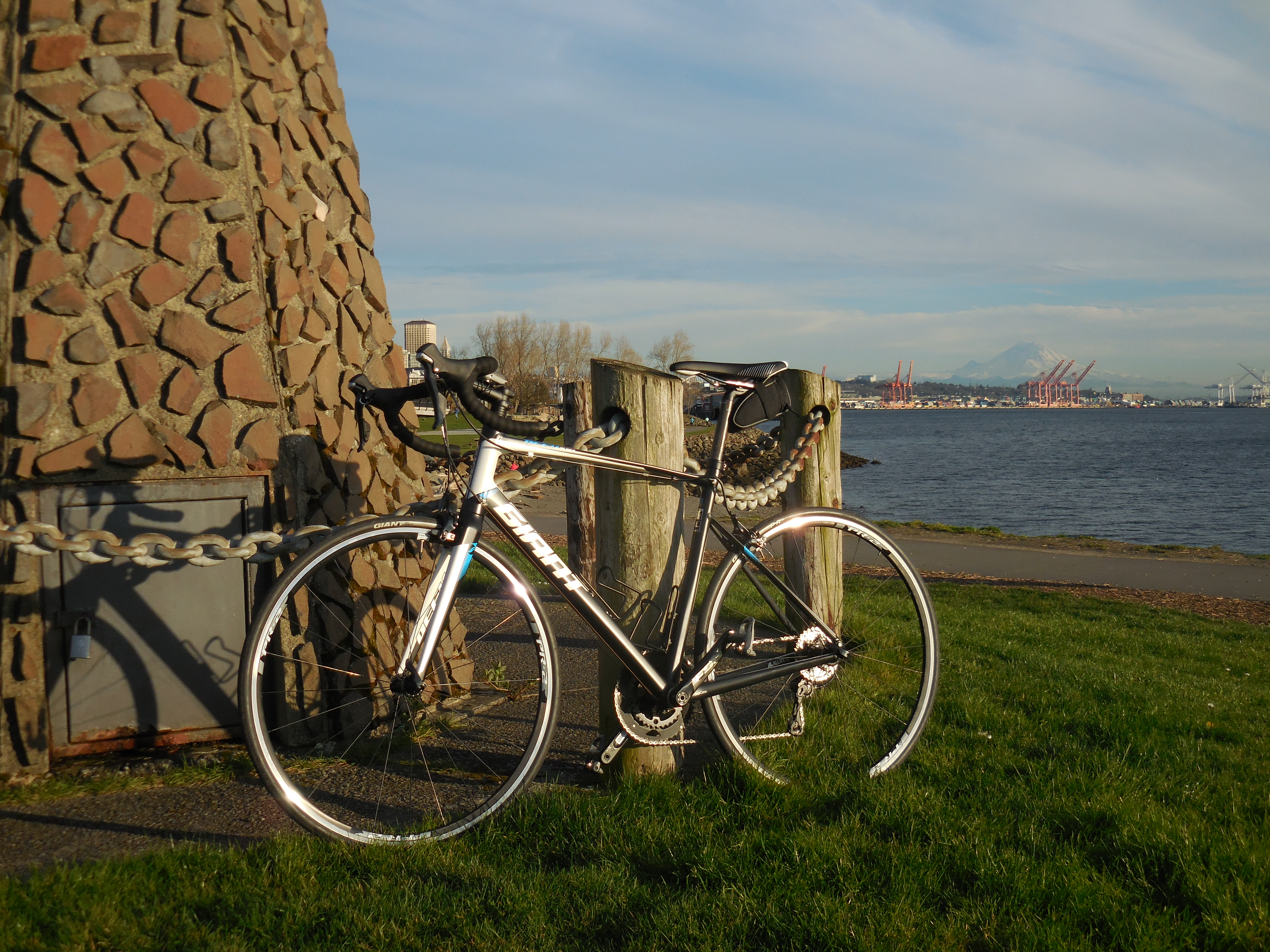 I picked up “my” 2015 Giant Defy 1, added my pedals and Garmin mount and nervously headed out into the scary streets of Seattle. The shop is located on Alaskan Way, so I made my way north and ended up on the bike path. Whew. Still alive. The weather was sunny and I saw a nice view of Mt. Rainier. I rode up a bit and then turned around and then nervously entered downtown traffic. I struggled because I had a bag with my street clothes and shoes in it (from my walk to the bike shop) and it kept swinging around in front of me. But wouldn’t you know, I survived and made it back to my hotel in one piece!