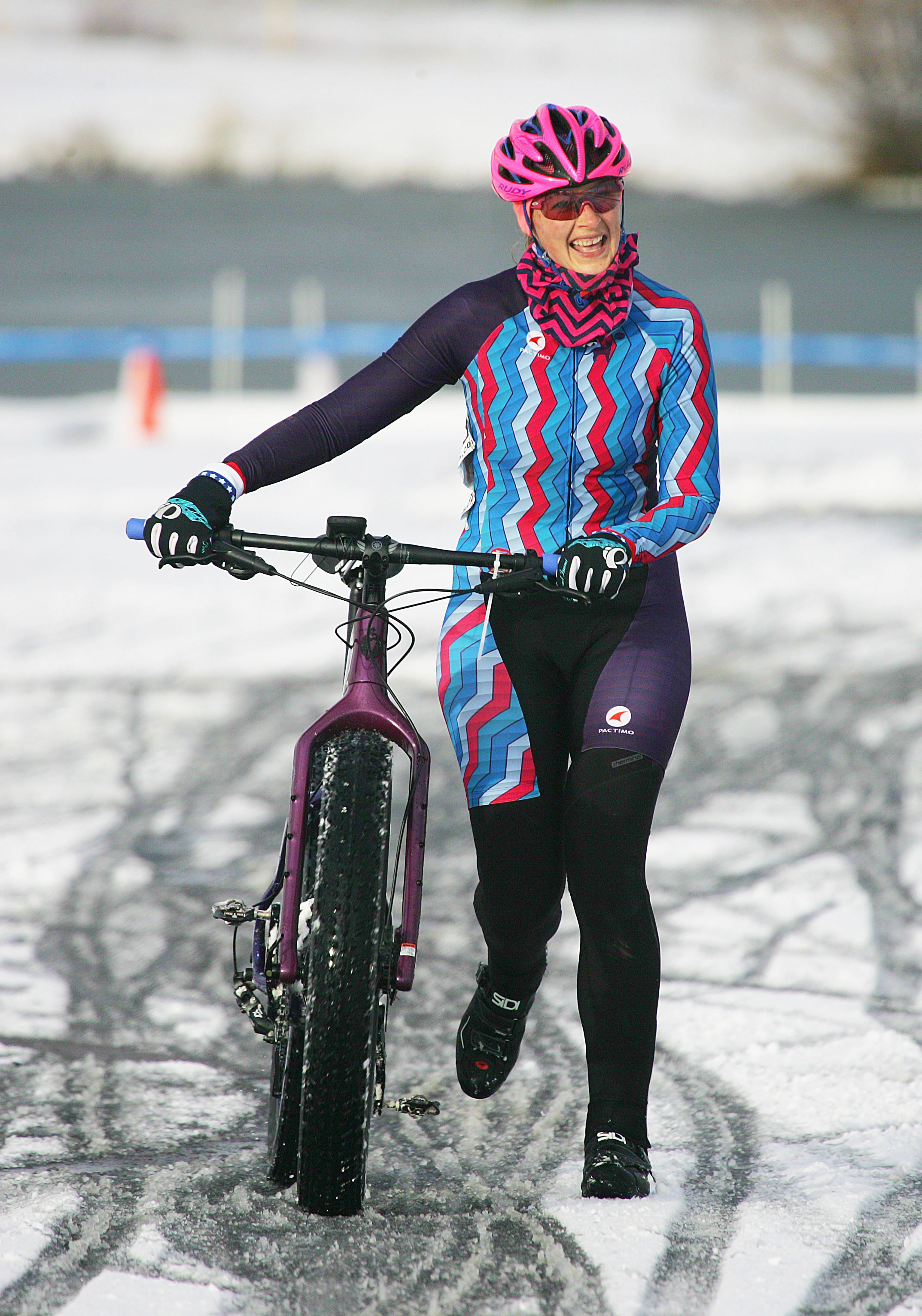 The next day on Sunday I awoke to snow, which was exciting! My 8am race was the inaugural fat bike race, a non-championshp category. I figured this would be just a fun race and a chance to ride around on my Dirt Components Thumper carbon wheelset. Unfortunately I would have another very nasty crash on the first lap, and my left arm yanked around behind me and tweaked my shoulder which I had just completed two months of physical therapy on for the split bicep tendon I have. I came through the start finish, and Larry (the announcer) called the medics over. I was crying and felt like a hot mess, and so mad that I had wrecked and re-injured my shoulder. But I pulled on my big girl skinsuit panties, and got back on my bike for another couple of laps! Turns out my rear tire would also go flat, so I had to run maybe the last half mile of the final lap. Man, it just wasn’t my race!